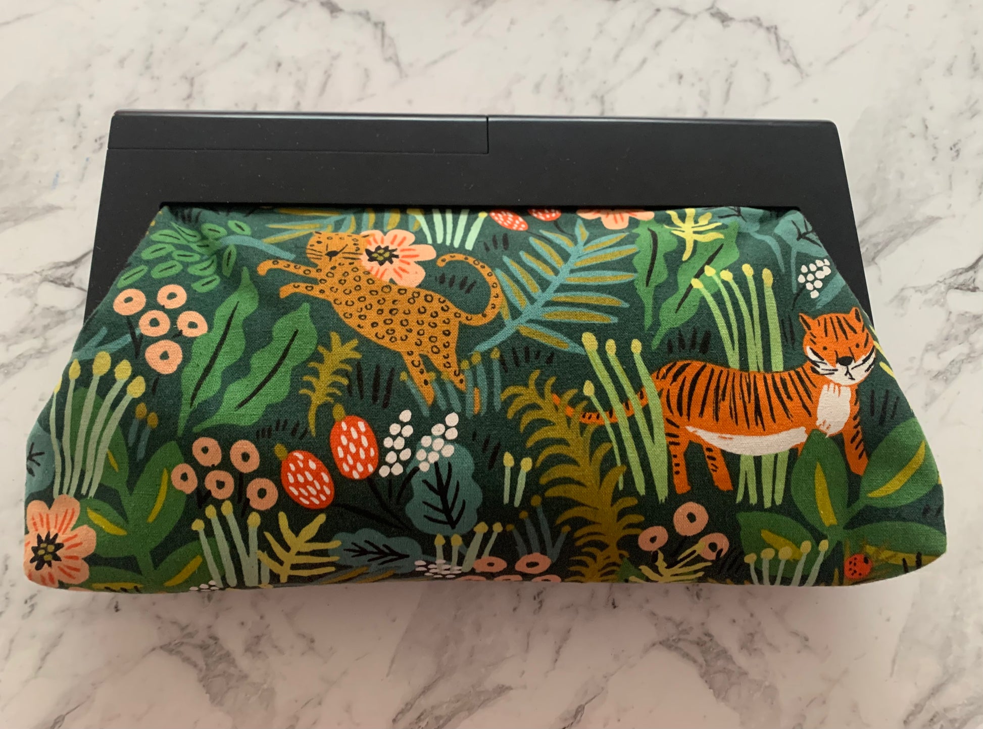 Get the perfect statement piece with Craft Me Up's one of a kind Wooden Frame Clutch. Featuring the Rifle Paper Co Jungle Hunter design and a unique black and white striped lining, it's perfect for any occasion.
