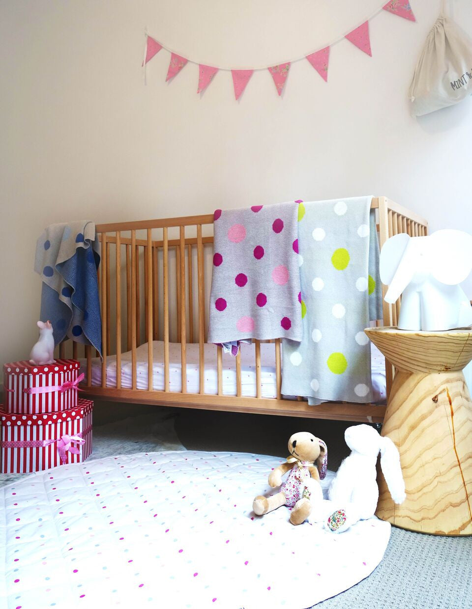 Lovely fitted cot sheet designed with baby polka dots on a white background.