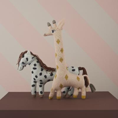 Knitted in dusky pink cotton with a smart gold diamond pattern all over her body and legs, a sweet little tassel tail and the longest neck, she's on the lookout for cuddles. And with those adorable long eye lashes, how can you resist?