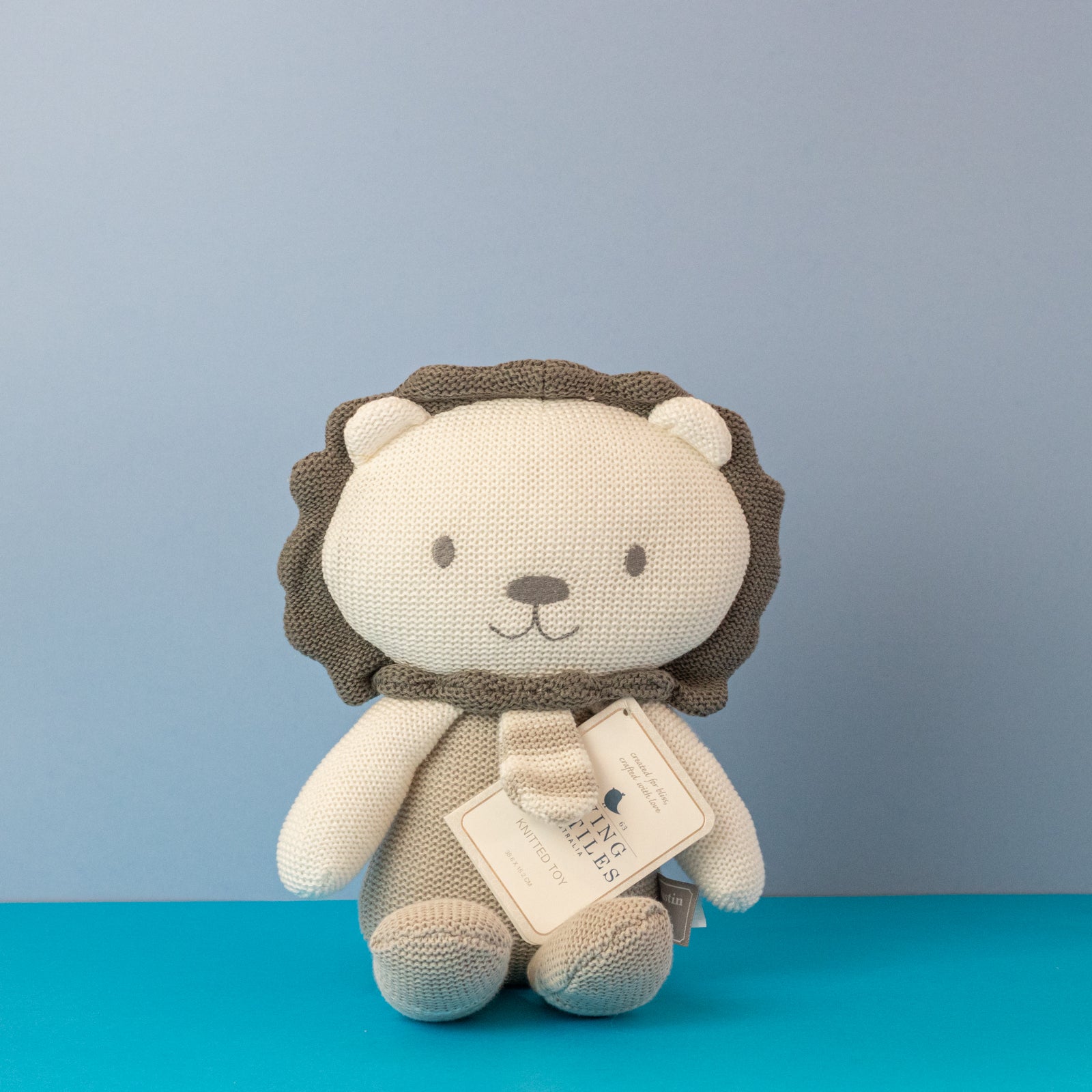 - Austin the Lion knitted toy - 40cm. Featuring a jingling rattle. 100% cotton knit, polyester fill.
