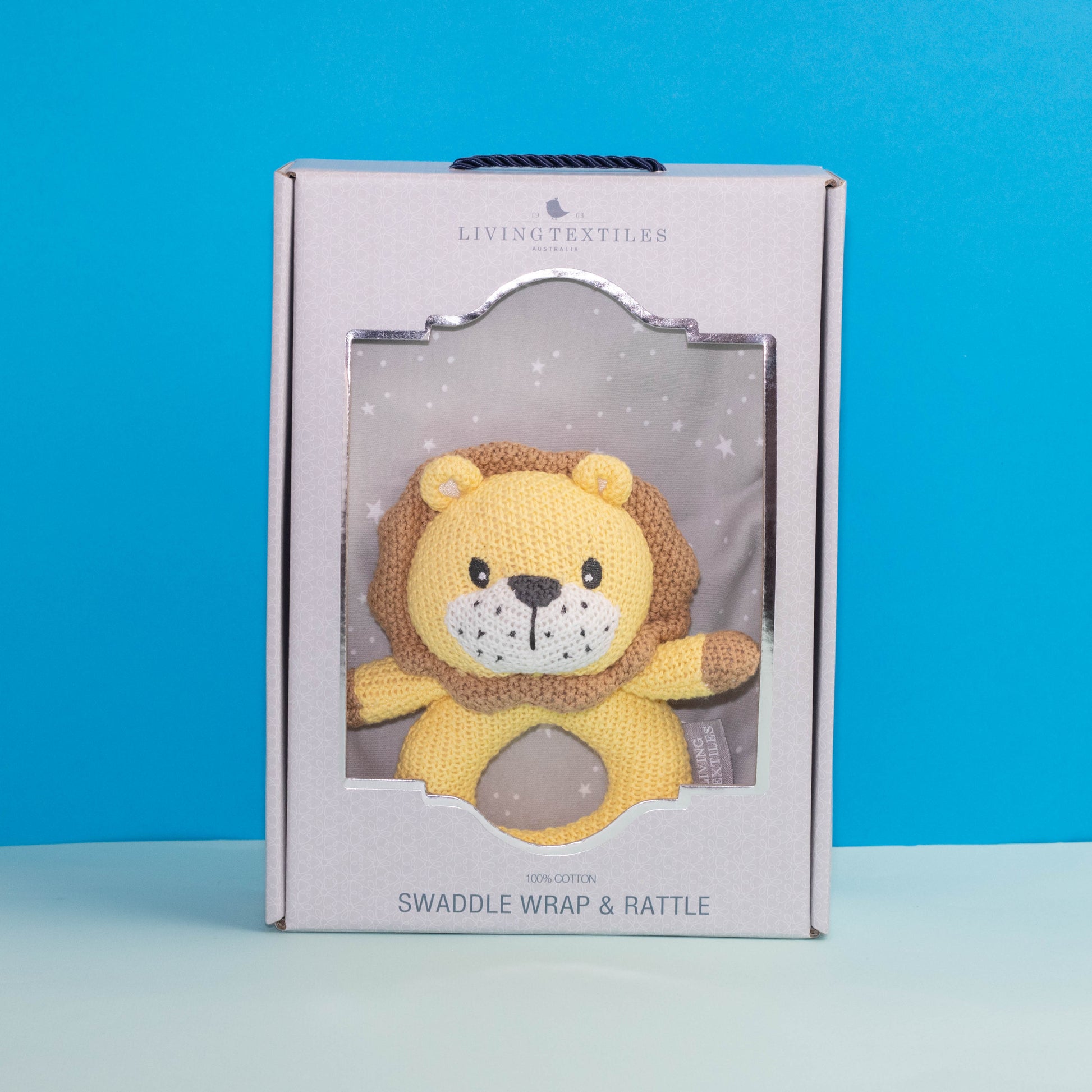 - Eli the Lion knitted toy - 37cm. Featuring a jingling rattle. 100% cotton knit, polyester fill.