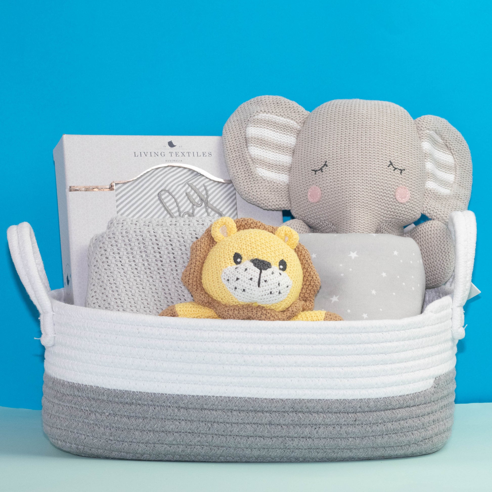 Our baby gift baskets have been thoughtfully curated with hand-picked boutique baby gifts from Living Textiles and are the perfect way to welcome a new baby into the world. Our baskets are packaged beautifully together in a reusable cotton rope storage hamper.